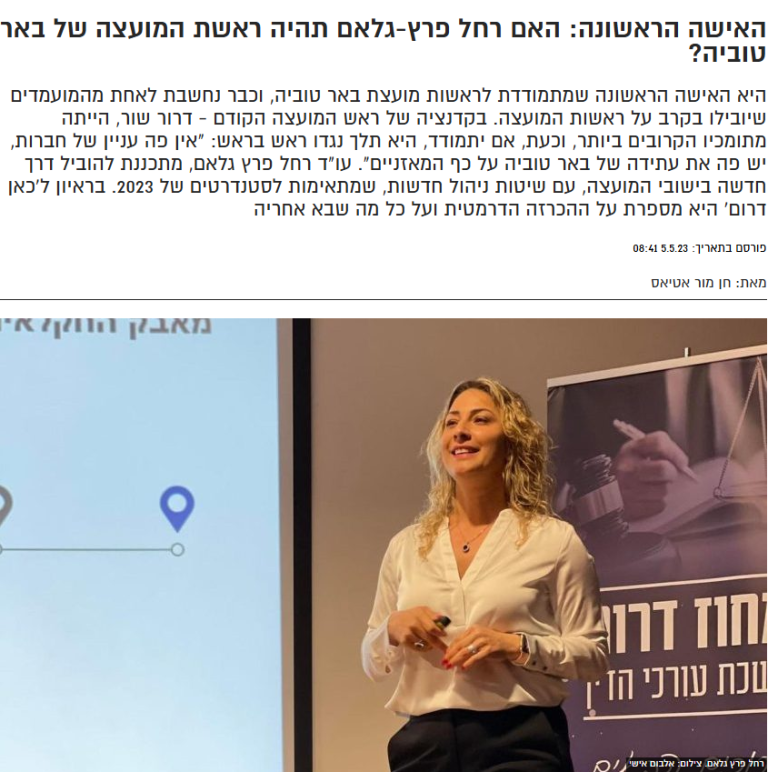 - בשנת 2023 עו"ד רחל פרץ-גלם התמודדה לרשות המועצה האזורית באר טוביה והייתה מתמודדת אישה מול 5 מתמודדים גברים.